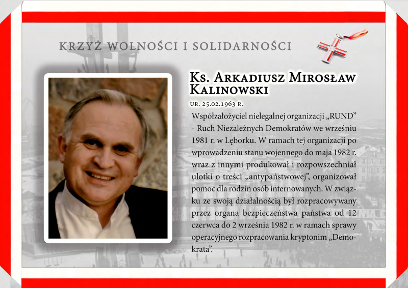 Ksiądz Arkadiusz KALINOWSKI - współzałożyciel nielegalnej organizacji „Ruch Niezależnych Demokratów”, w ramach której po wprowadzeniu stanu wojennego produkował i rozpowszechniał ulotki o treści antypaństwowej” w Lęborku.