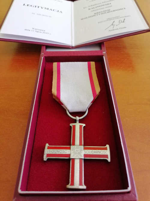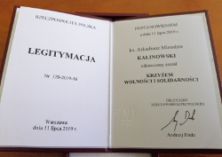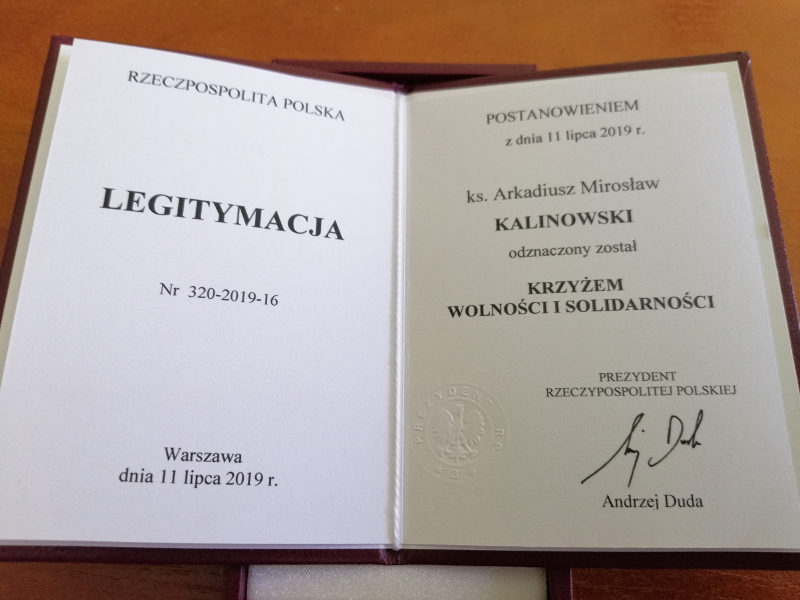za wybitne zasługi w działalności na rzecz przemian demokratycznych w Polsce, księdza proboszcza Arkadiusza Kalinowskiego odznaczono