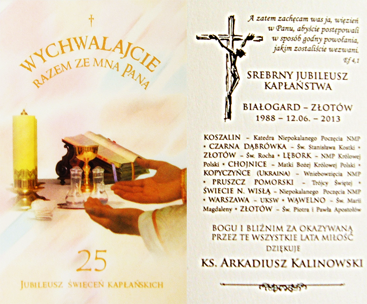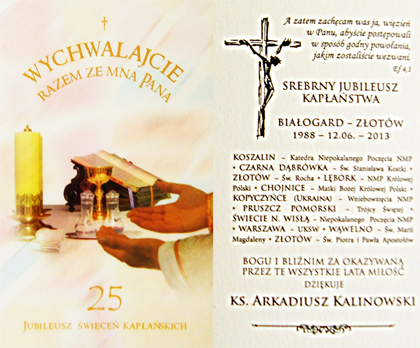 W środę 12 czerwca ksiądz Proboszcz Arkadiusz Kalinowski odprawił uroczystą Mszę Świętą z okazji 25-lecia swoich święceń kapłańskich. Zachęcamy do obejrzenia krótkiej fotorelacji z tej uroczystości.